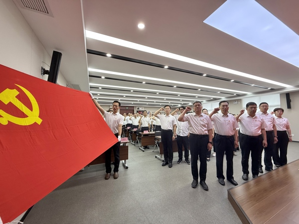 大會(huì)在莊嚴(yán)的國(guó)歌中拉開序幕。王振林帶領(lǐng)新接收預(yù)備黨員進(jìn)行集體宣誓,老黨員們重溫入黨誓詞。